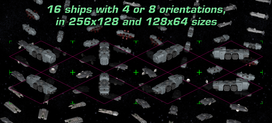 16 isometric spaceships in two sizes (256x128 and 128x64). For each size there are two spritesheets : one with 4 orientations and one with 8 orientations. Also included is a layered file with all the 256x128 sprites to allow custom resizing of all the sprites.