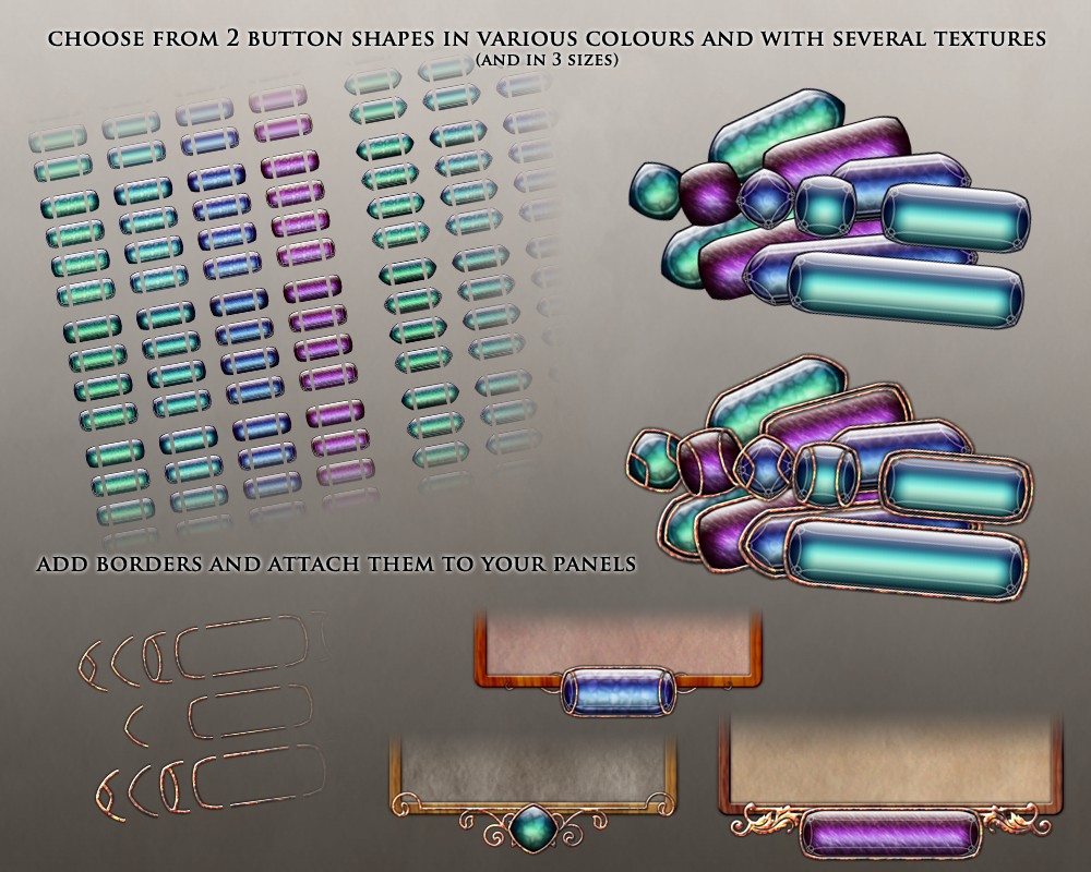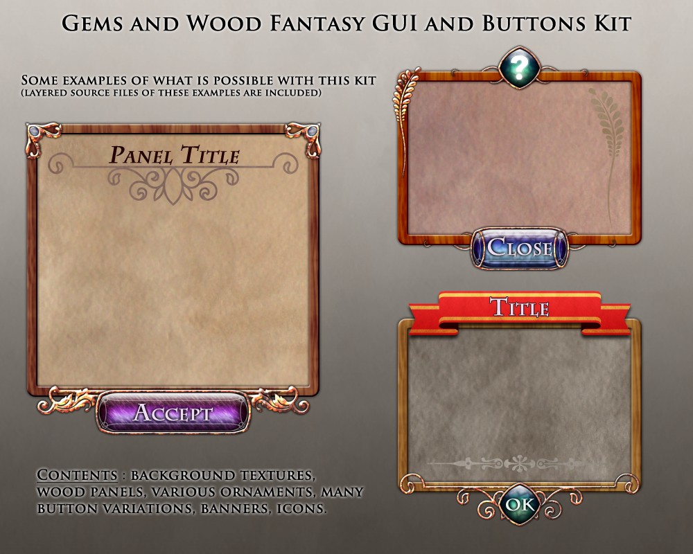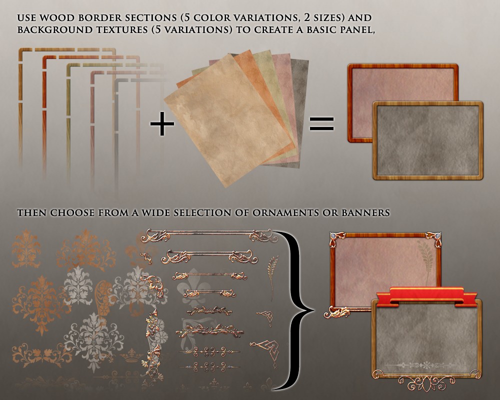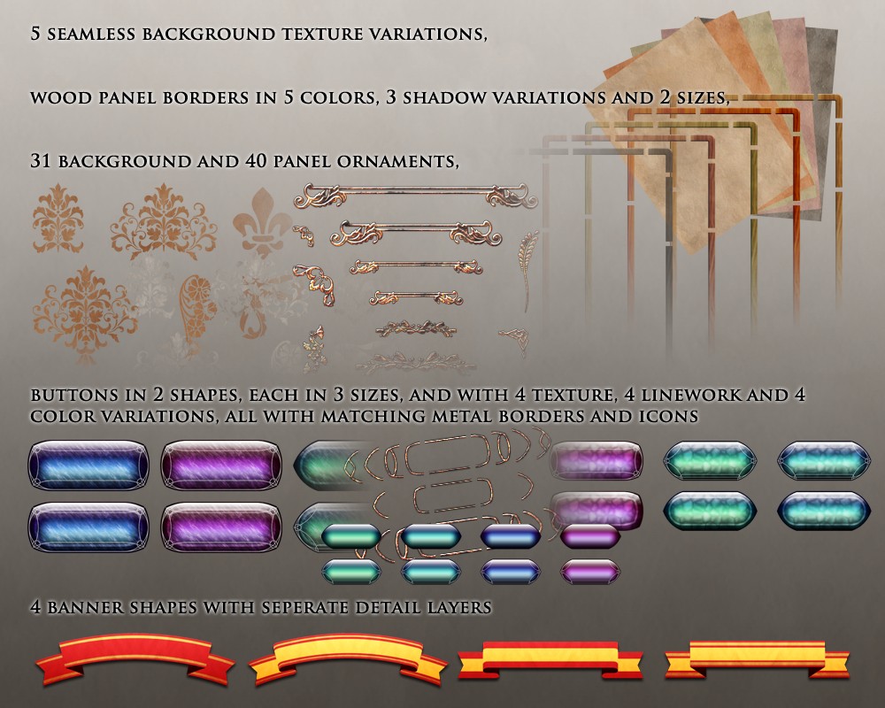 This set includes wood borders and buttons split up in parts to allow you to make panels and buttons of all sizes. Also included are seamless background textures, many ornaments (regular and metal), some banners and icons.