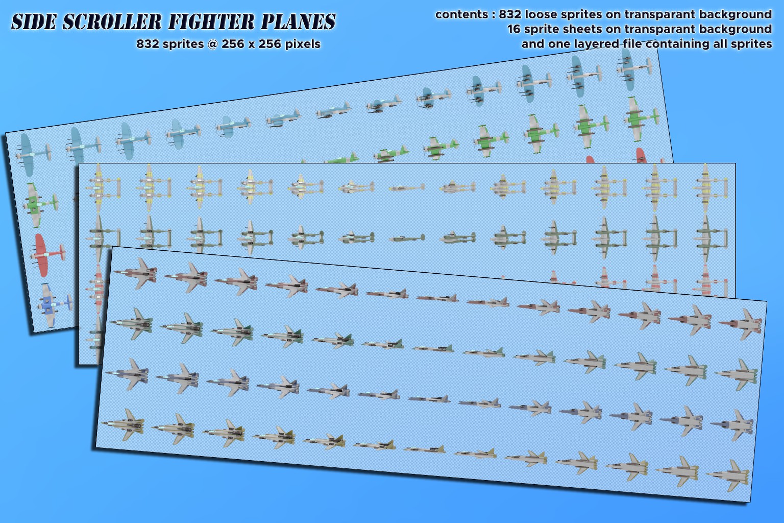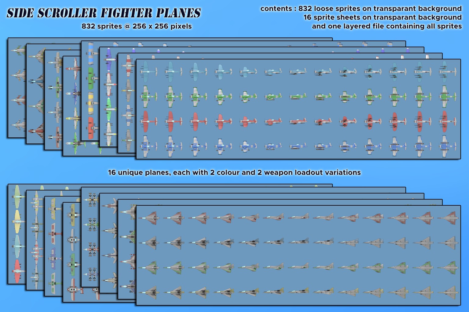 This set has 832 sprites in total, provided as single images, and grouped on spritesheets per plane type. Also included is a single layered file containing all sprites sorted in groups per plane.