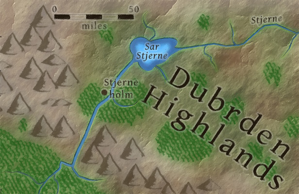 The Dubrden Highlands lie north of the Dubrden Peaks. The western edge of the area is a smaller mountain range that splits off from the Peaks. On the other side of this range lie the Dubrden Lowlands. While milder in climate than the Lowlands and with more vegetation, no large nations ever formed in the area, instead there are many smaller communities and settlements. The largest community is a group of villages of varying sizes, called Stjerneholm, which means Home of the Star, the name the earliest inhabitants of the region gave to their lands. Old legends speak of an asteroid impact which resulted in a crater that over time formed the large lake in the centre of the Highlands, called Sar Stjerne (Sea of the Star).